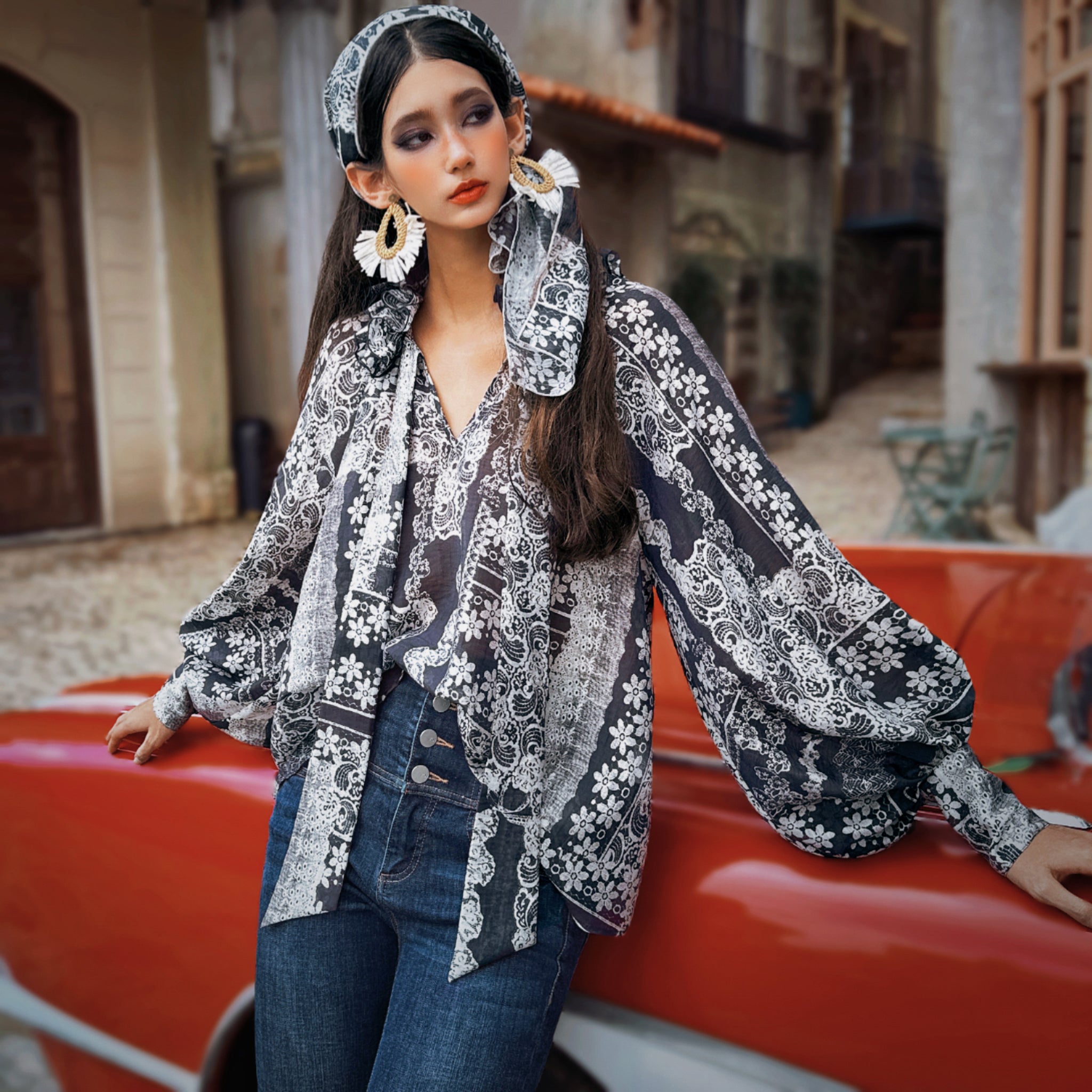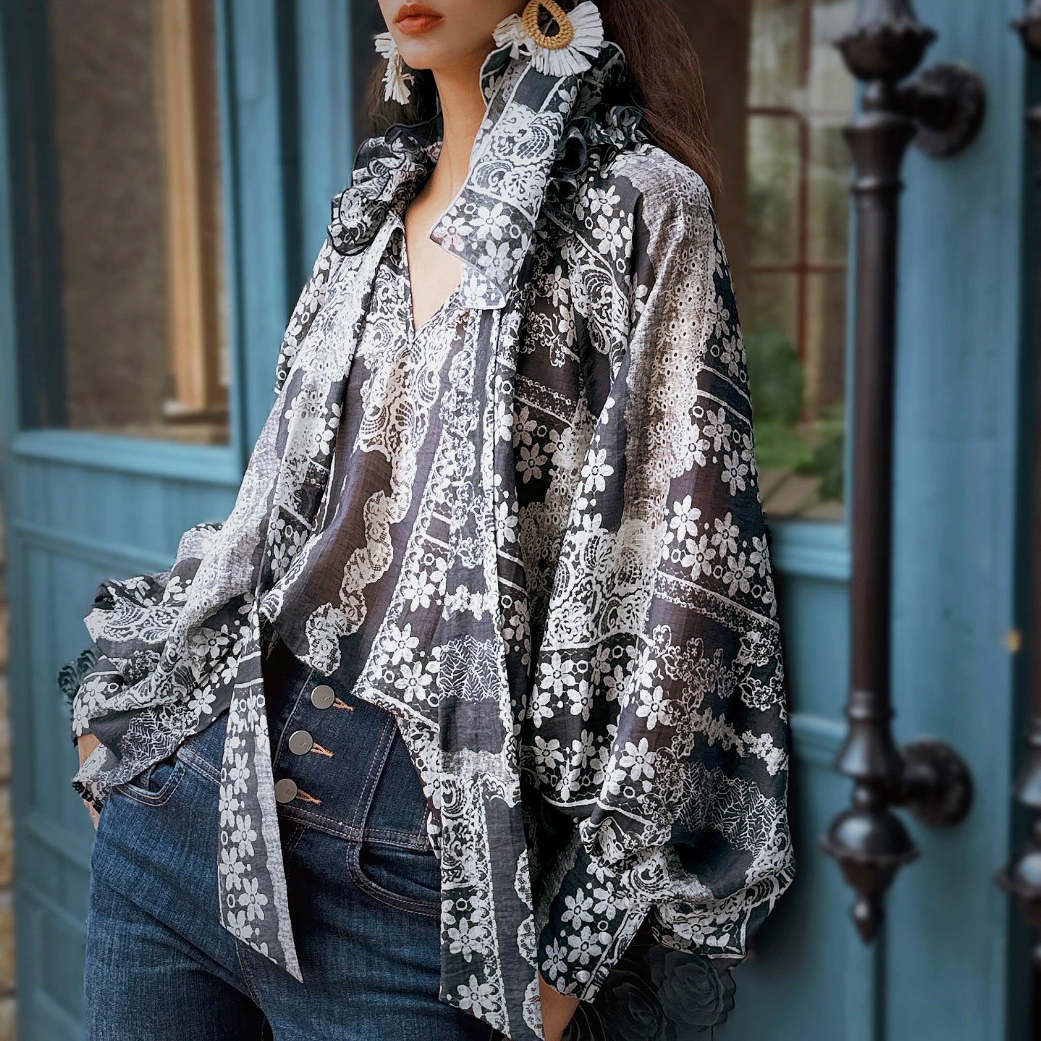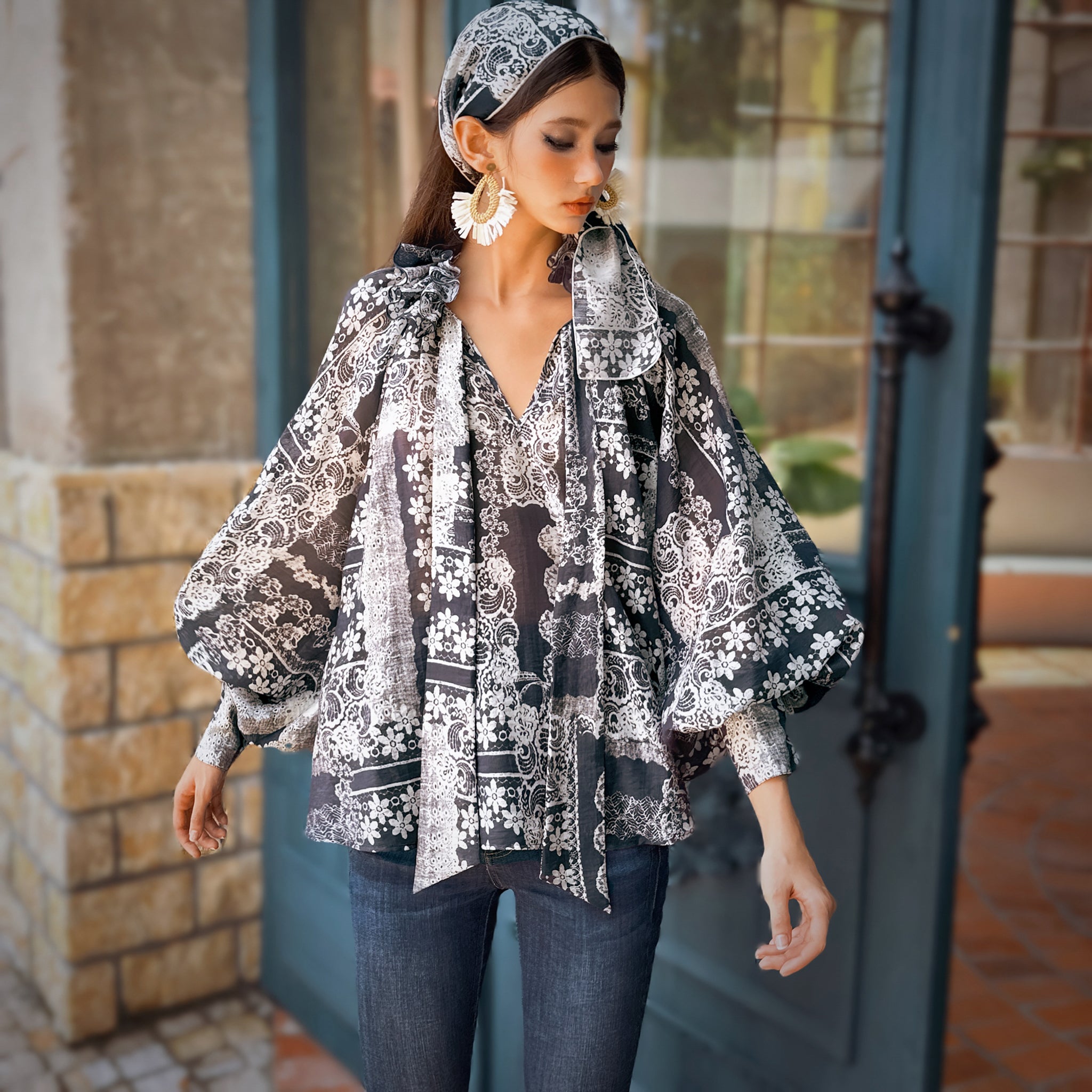 Monochrome drama with zero effort. This relaxed boho blouse features a black patchwork lace-style print, a soft ruffle collar with a removable-look tie, and airy balloon sleeves that finish with classic button cuffs. Lightweight and flowy—tuck into denim or trousers and you’re out the door.
