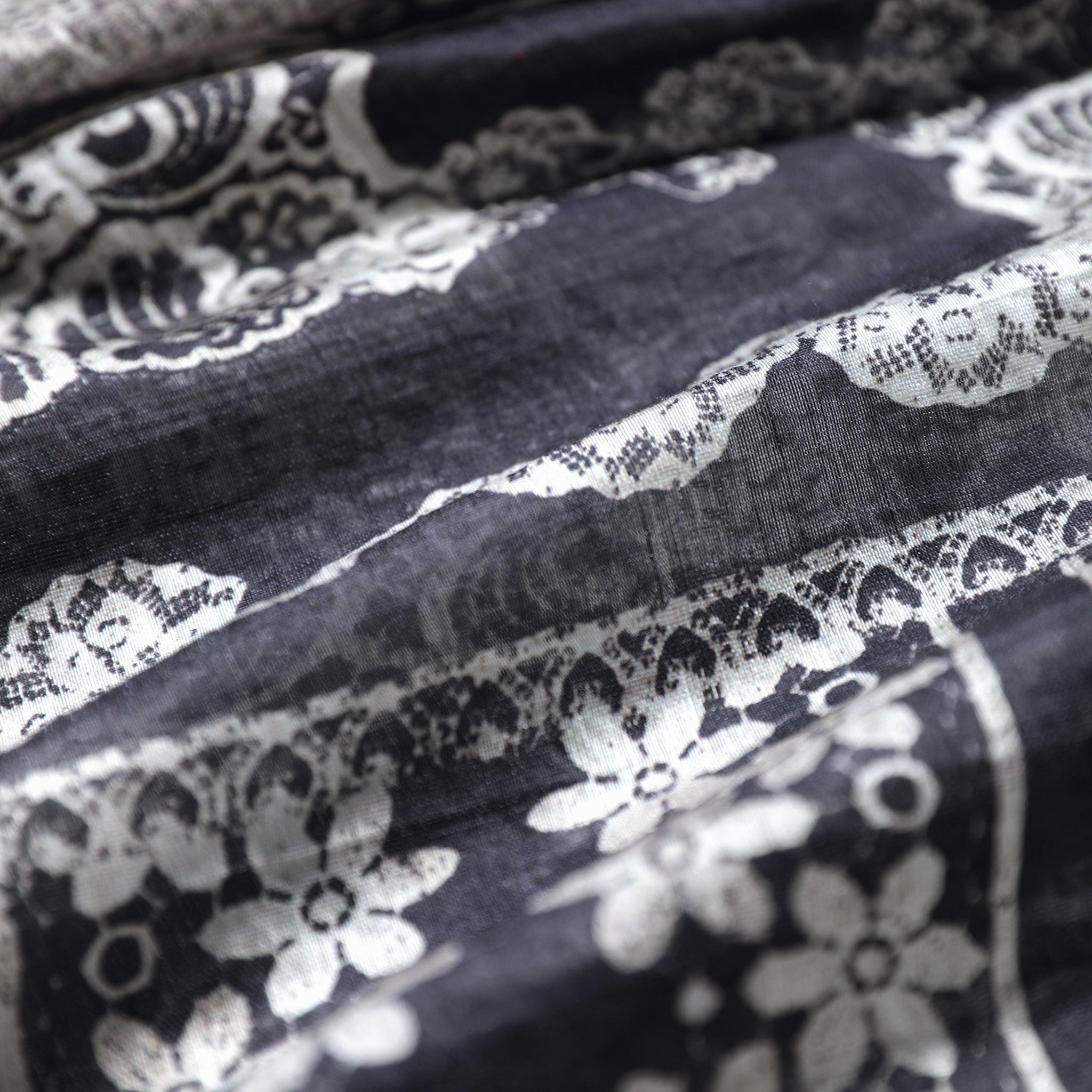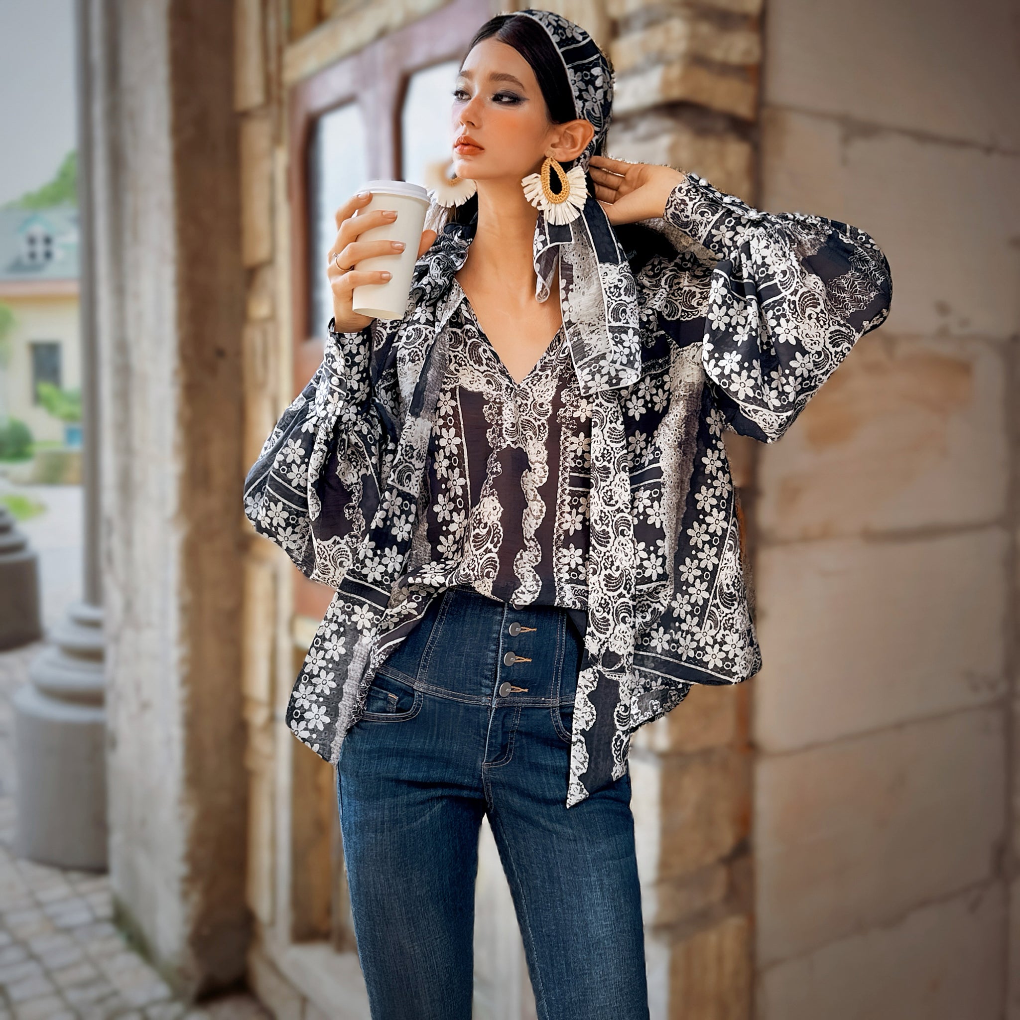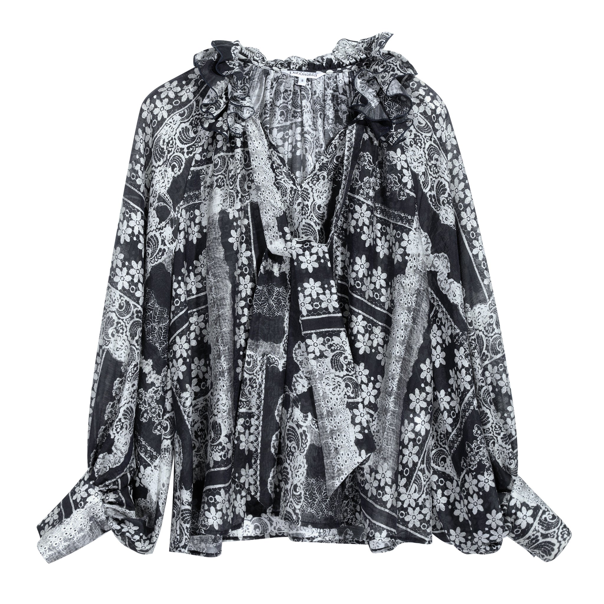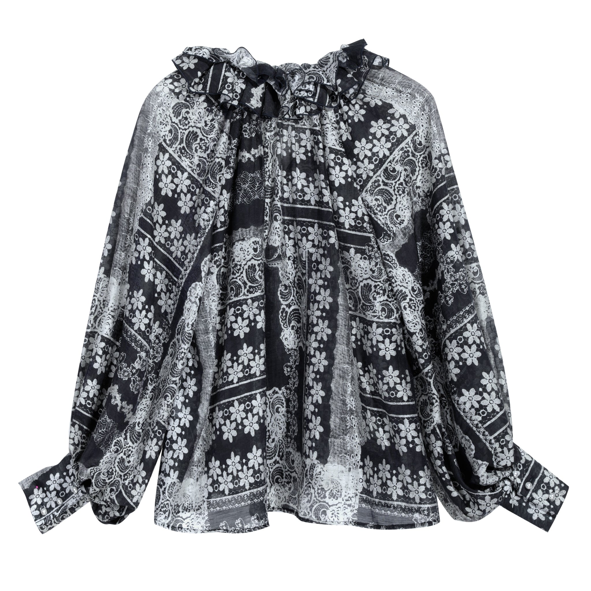 Monochrome drama with zero effort. This relaxed boho blouse features a black patchwork lace-style print, a soft ruffle collar with a removable-look tie, and airy balloon sleeves that finish with classic button cuffs. Lightweight and flowy—tuck into denim or trousers and you’re out the door.