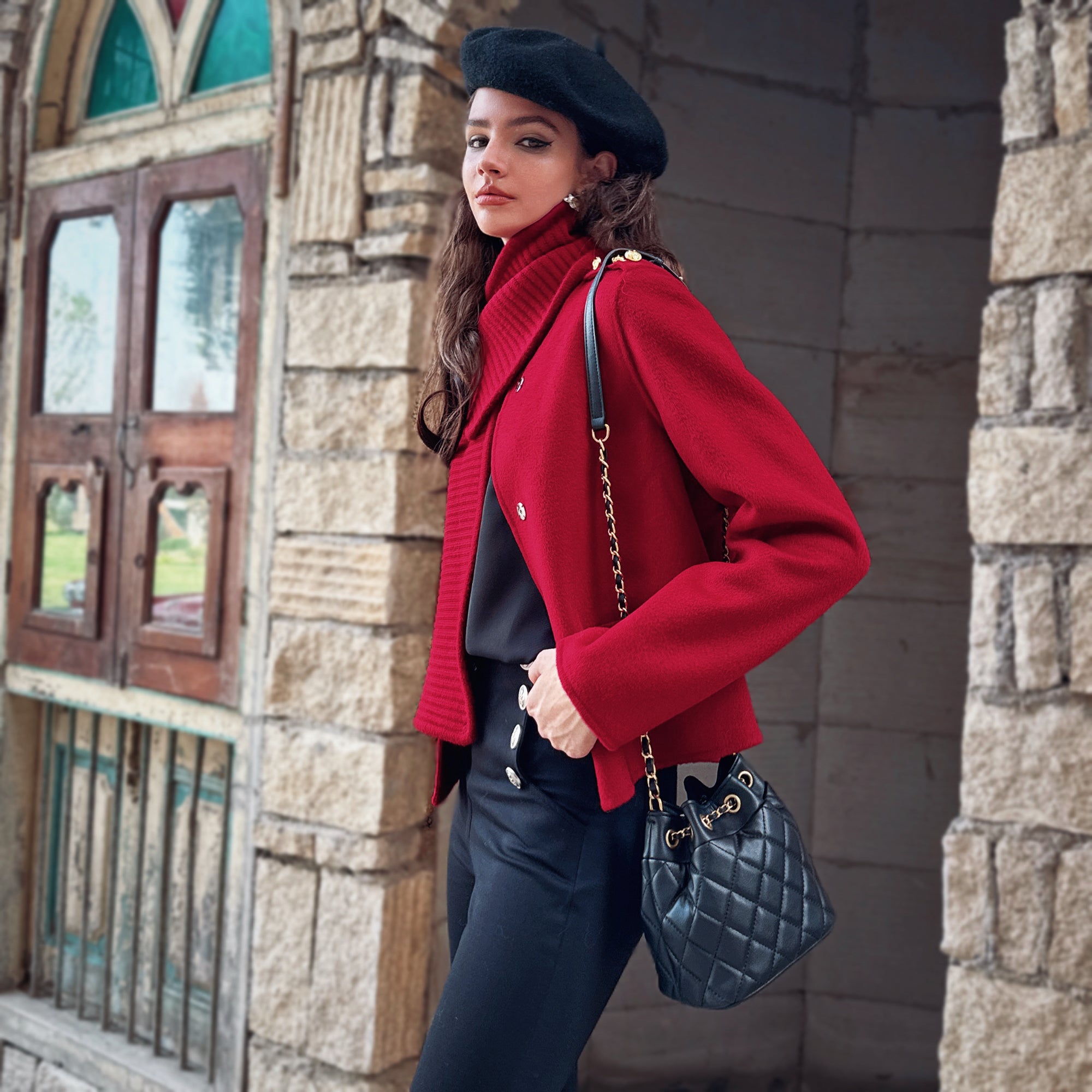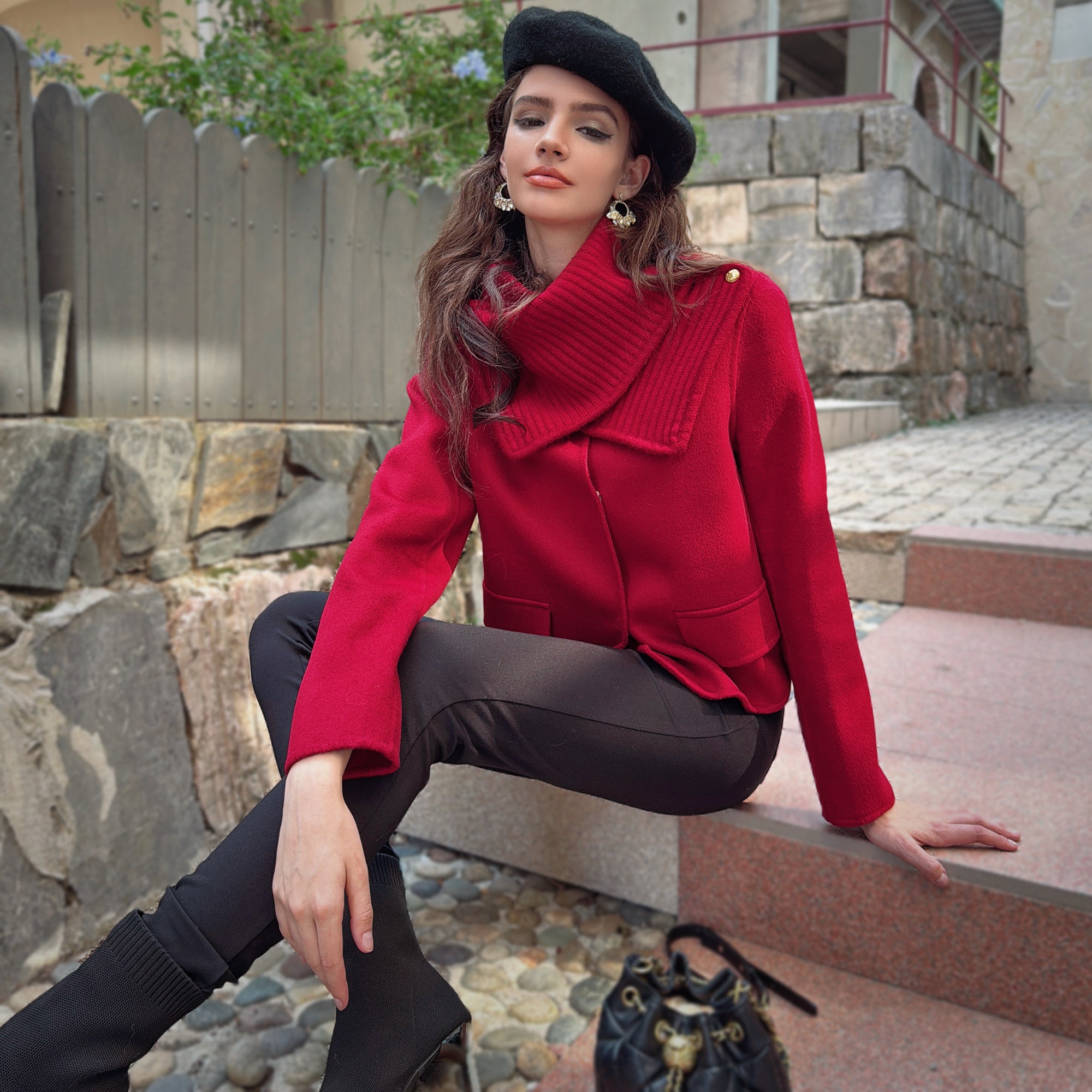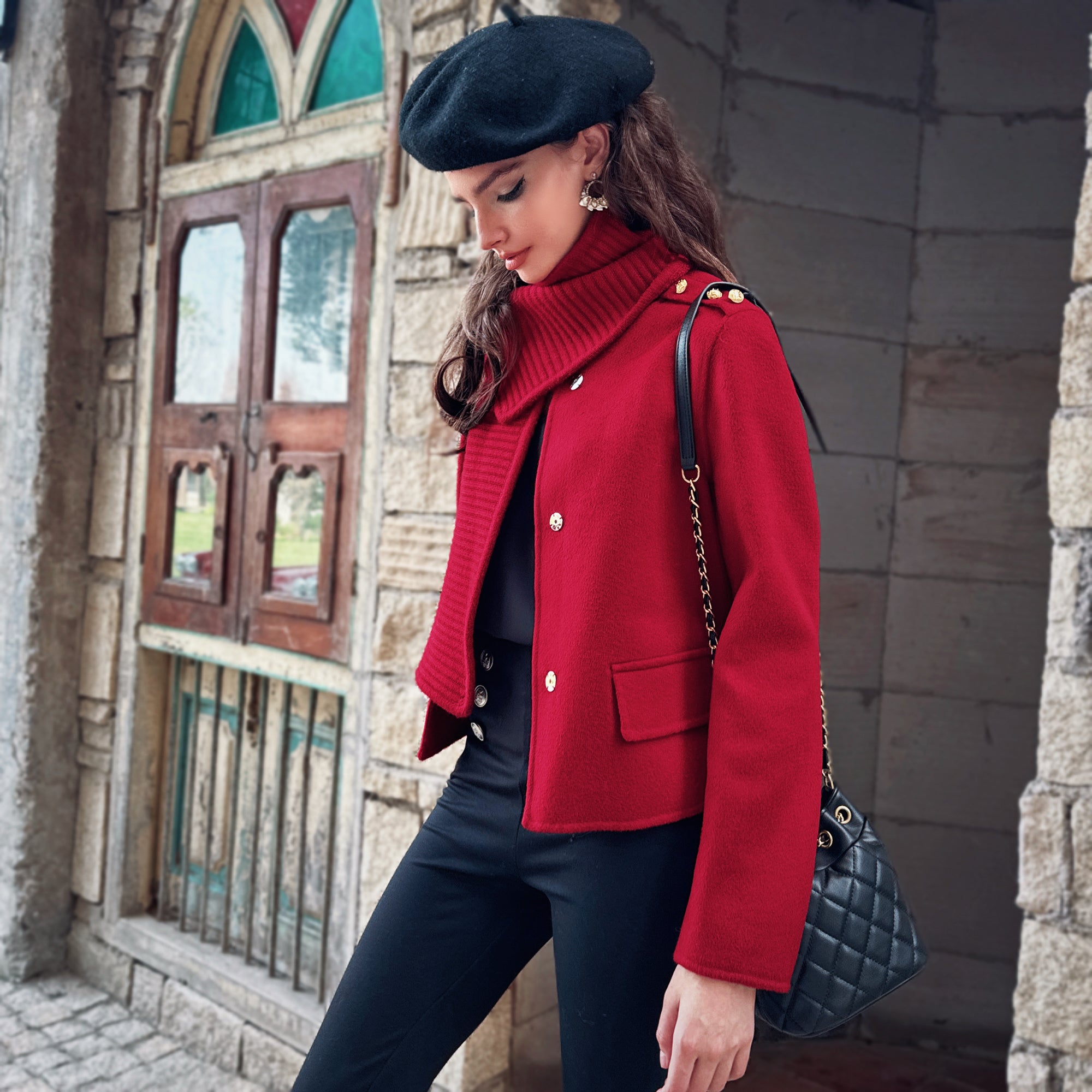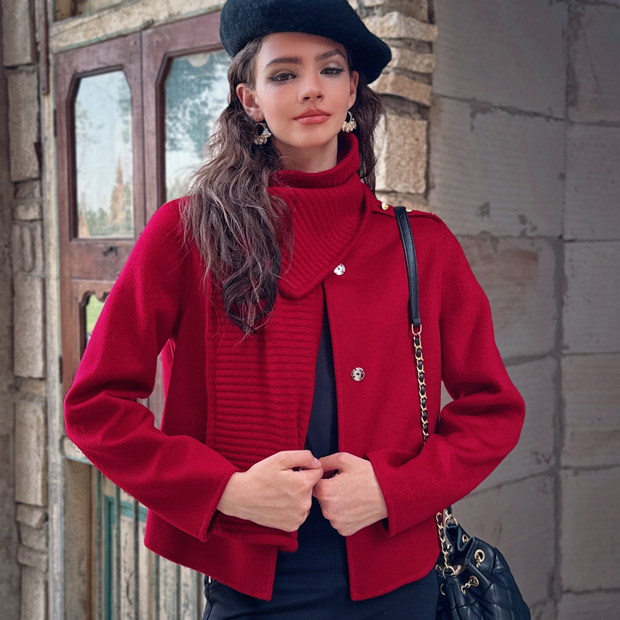 This short jacket mixes a clean, structured shell with a cozy rib-knit scarf collar you can style up or down. The cropped length hits just right with high-waist pants and skirts; gold-tone shoulder hardware adds a subtle military snap. Throw it on and look instantly put-together.
