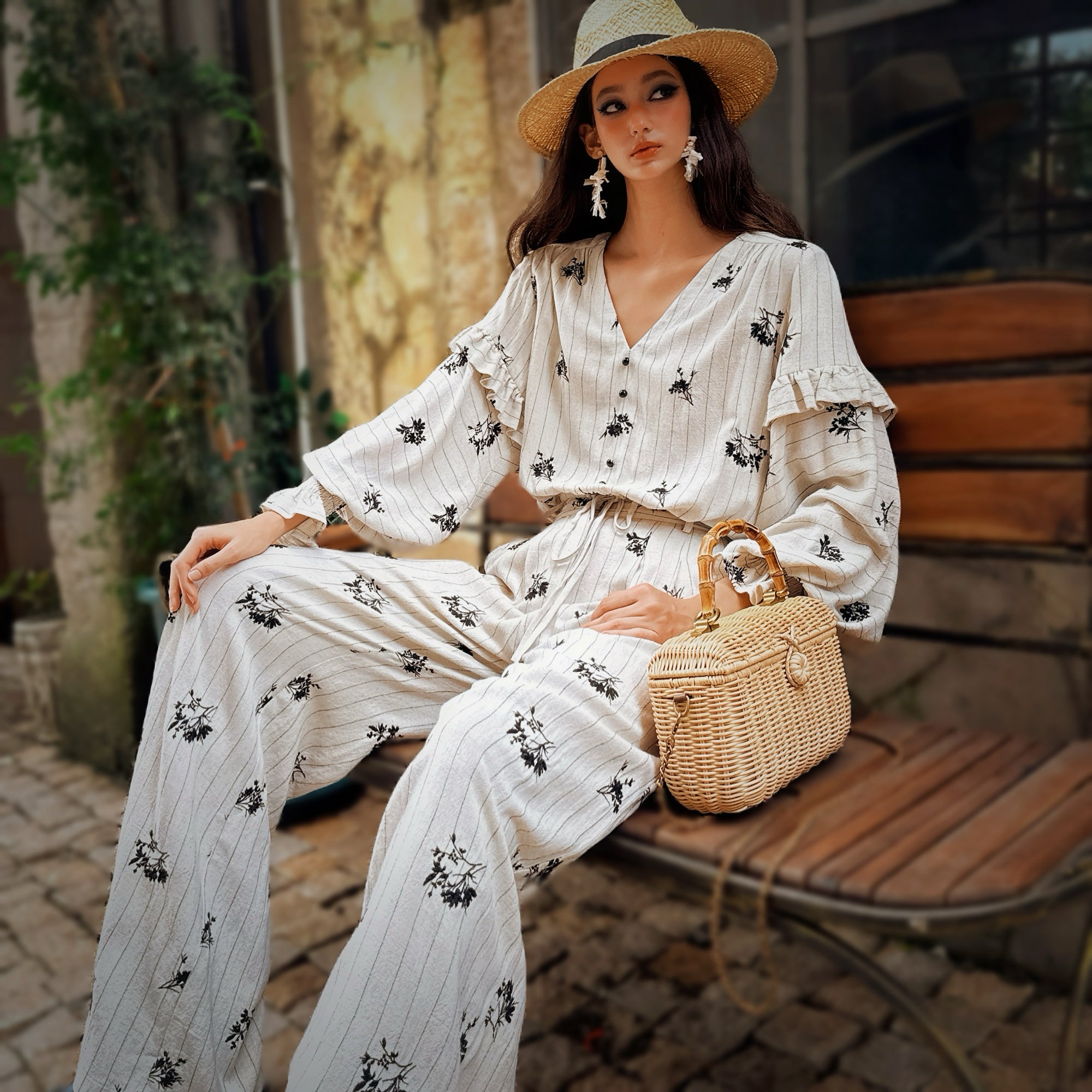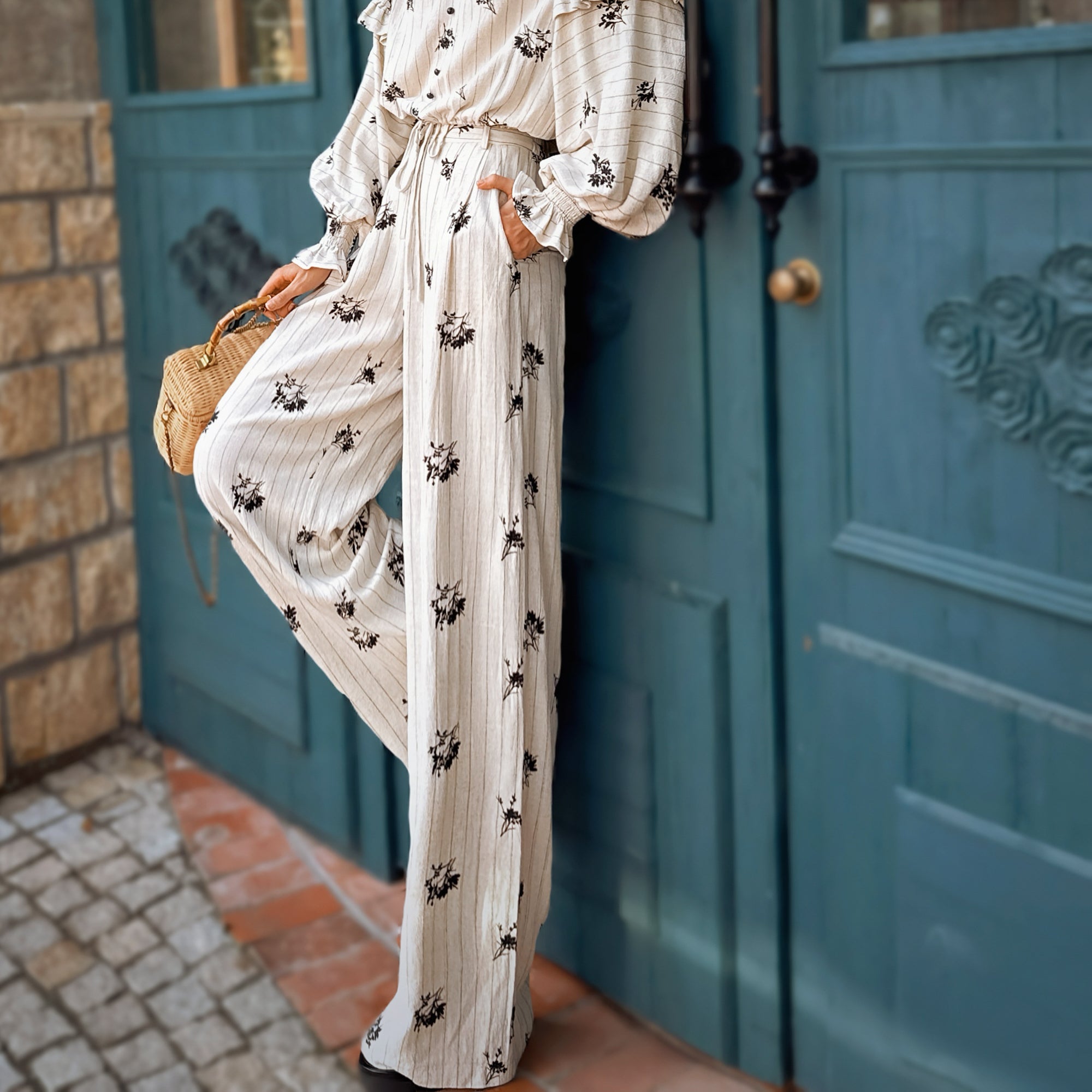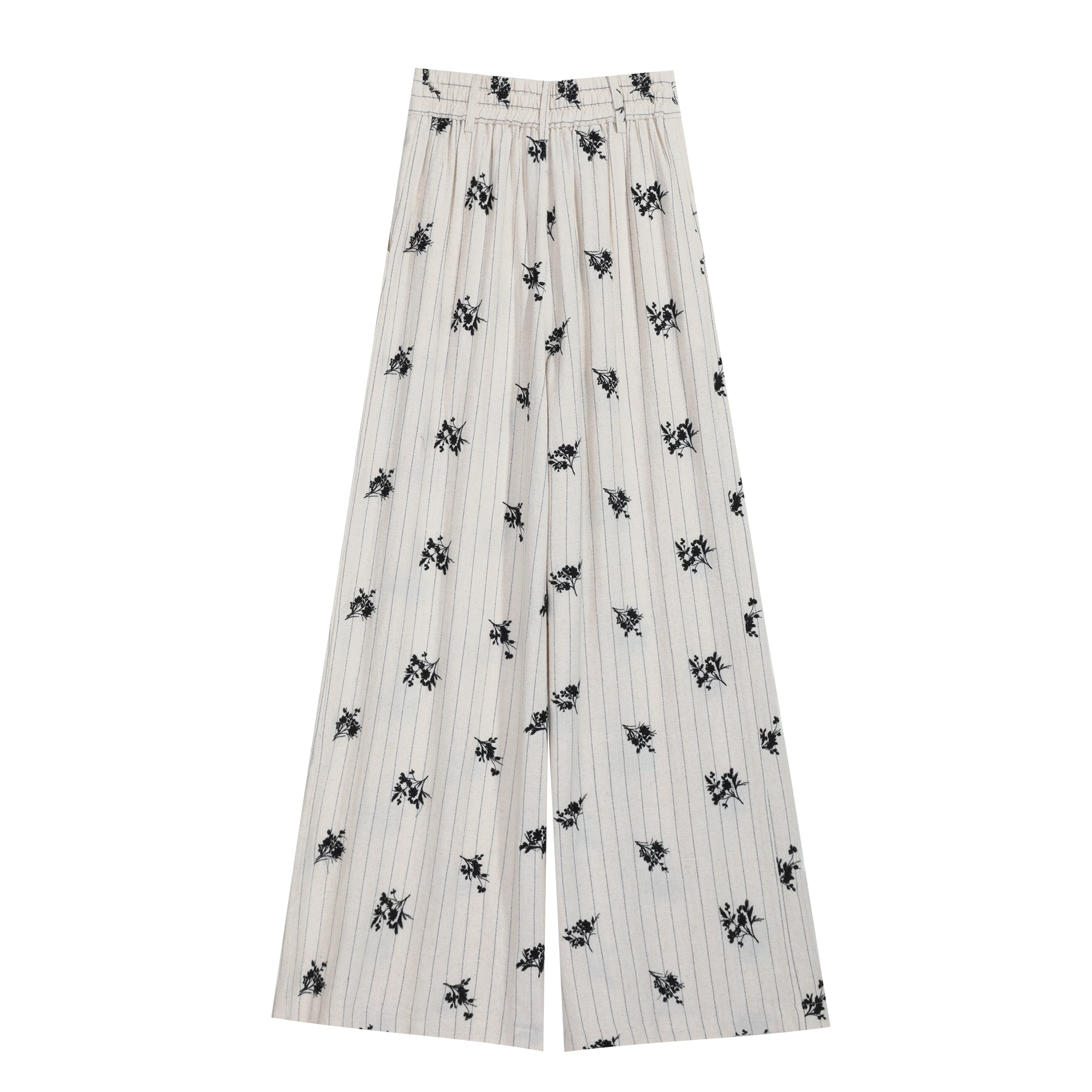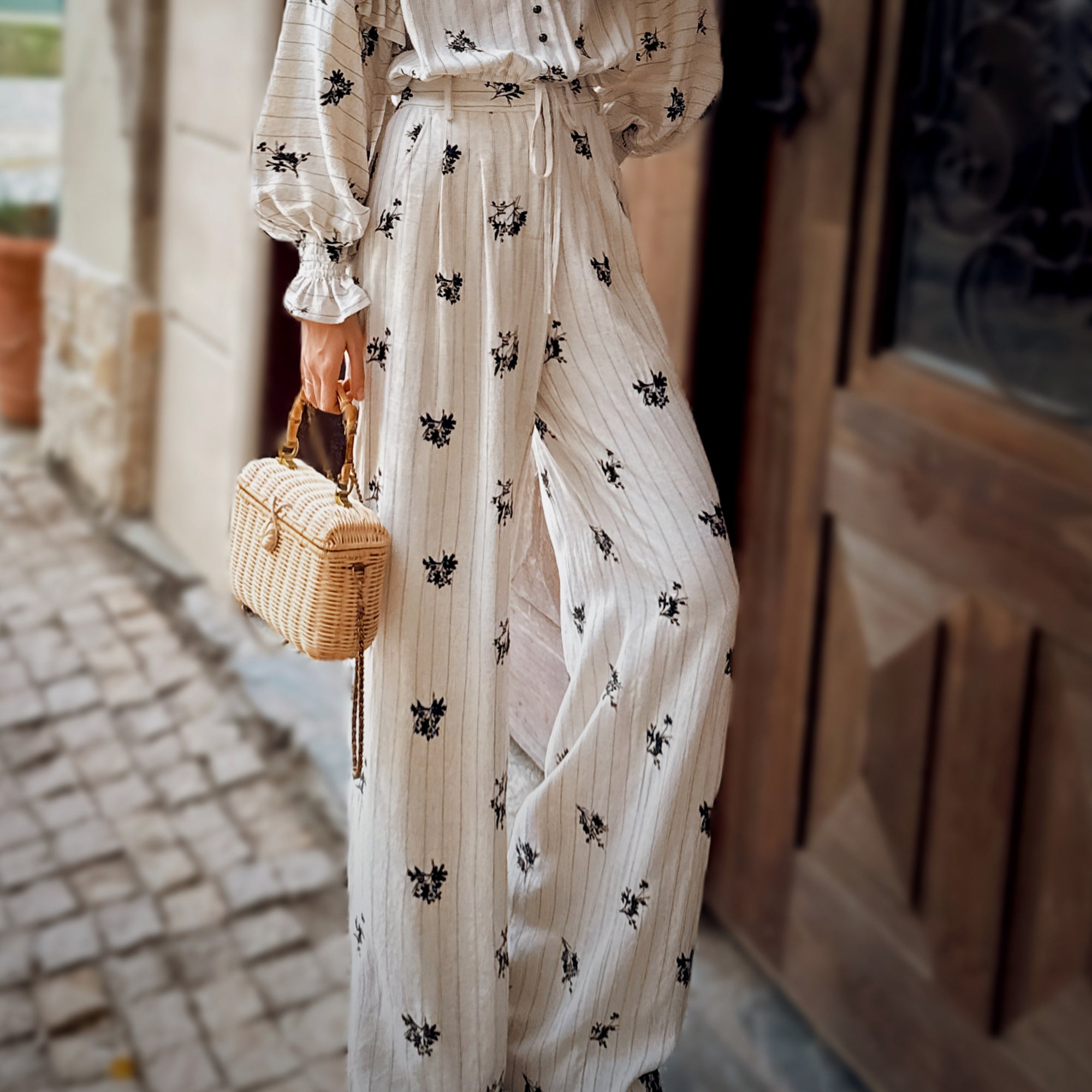 Breezy, tailored, and very boho. These high-waist trousers mix fine pinstripes with scattered floral motifs for a laid-back luxe vibe. A pleated front gives drape through the leg, while the wide-leg cut skims without clinging. Easy to dress up with heels or keep casual with flats.