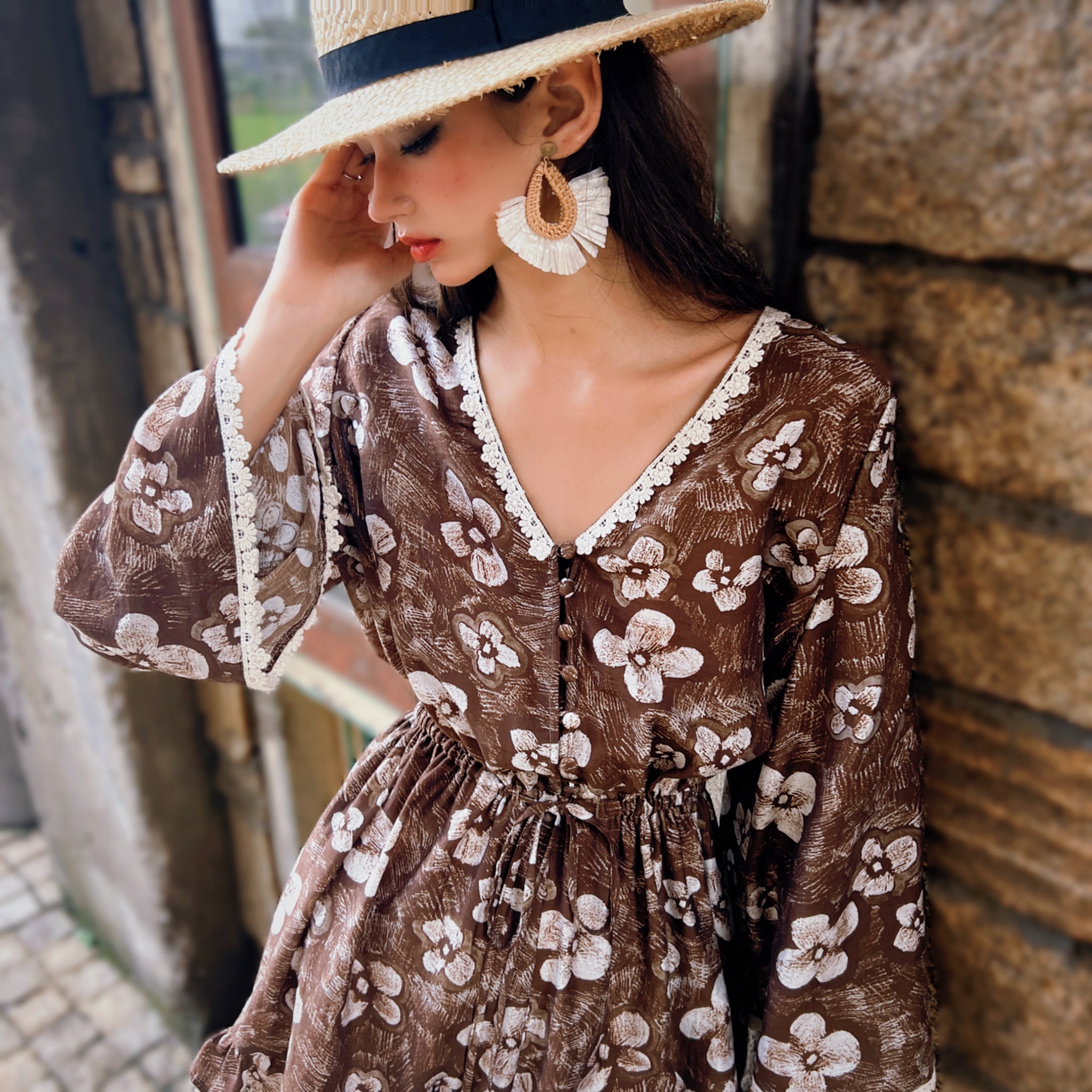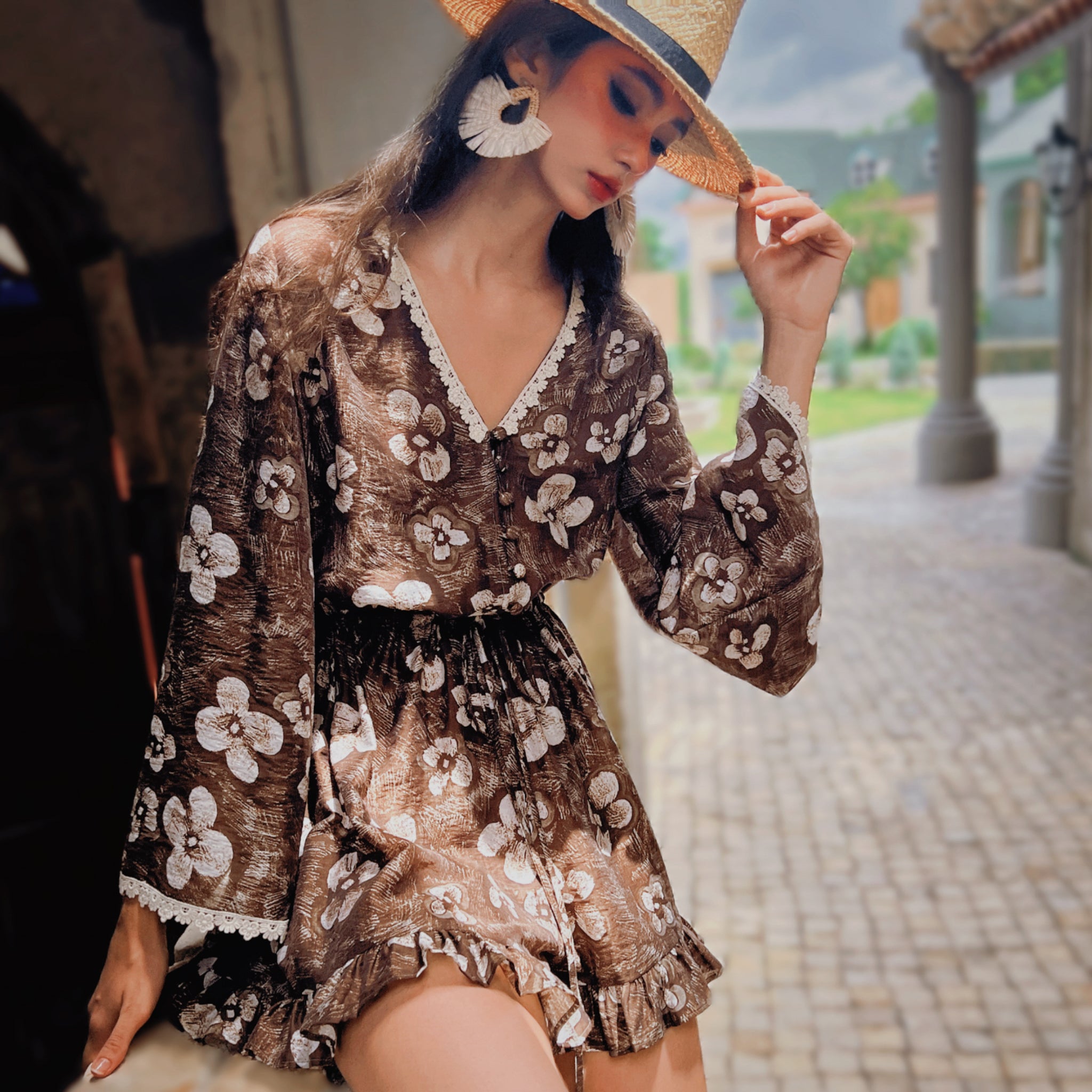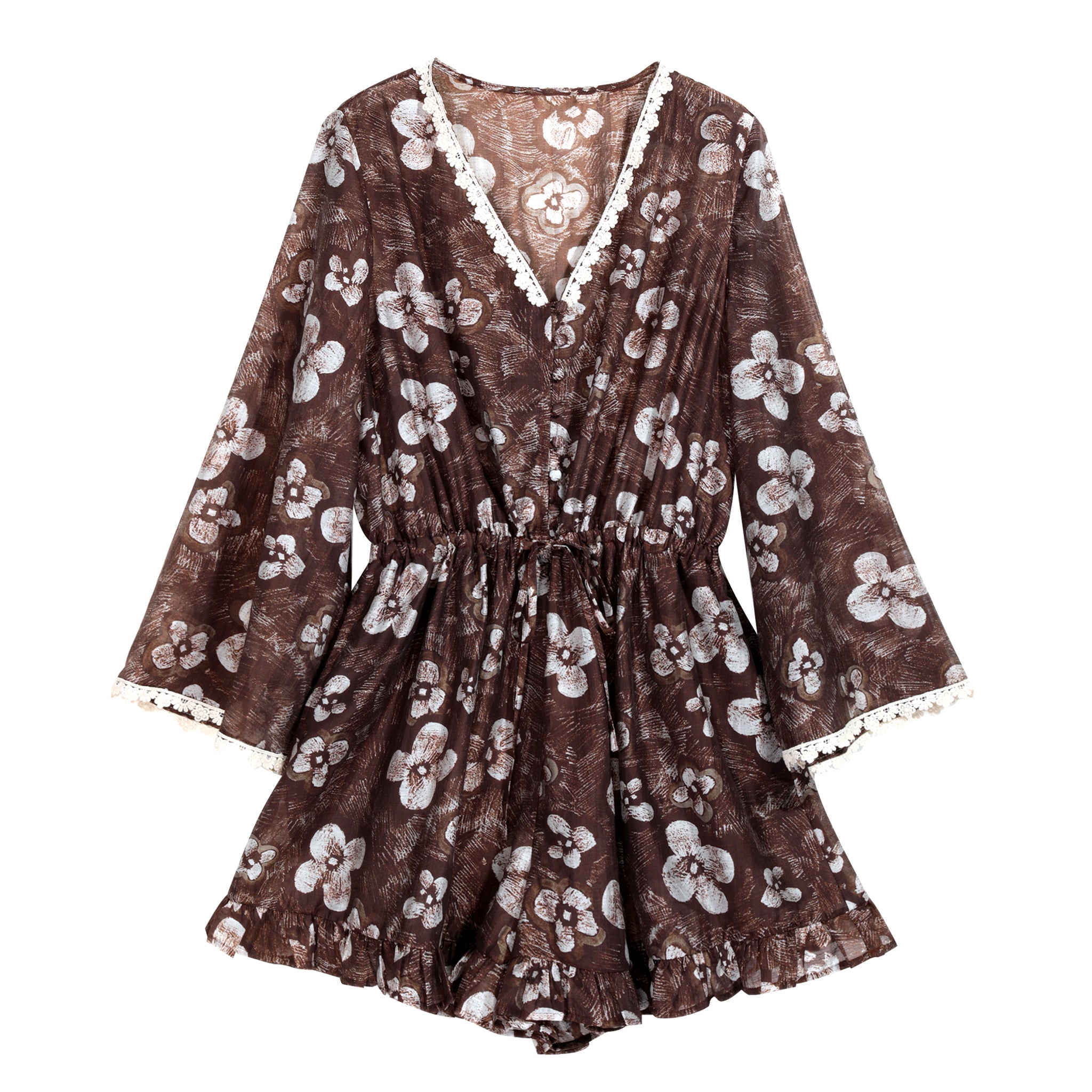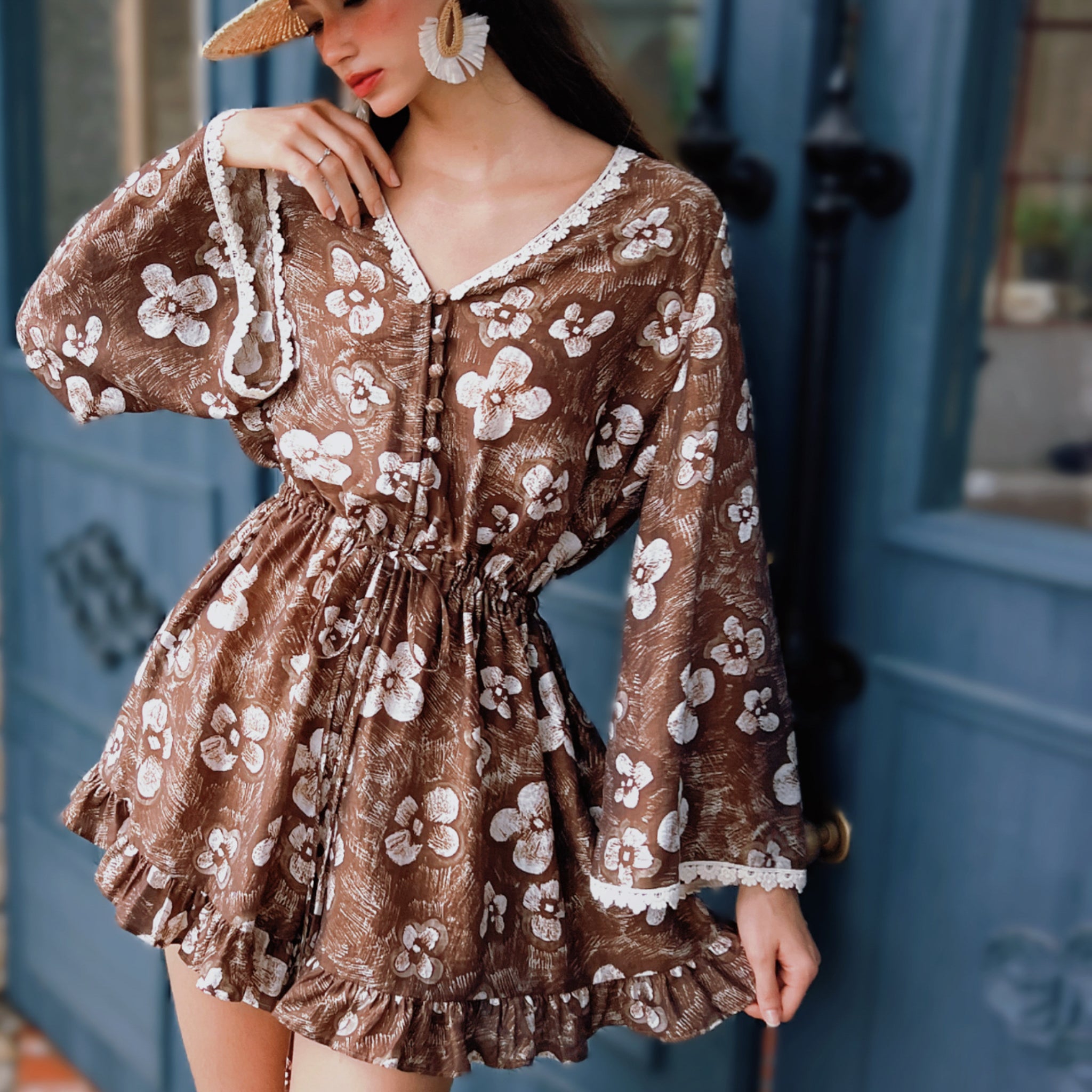 A lightweight, breezy romper in a cocoa floral print with lace-trim V-neck. The elastic drawstring waist snatches you in; the bell sleeves and ruffled hem keep it playful. Throw on sandals and call it a look.