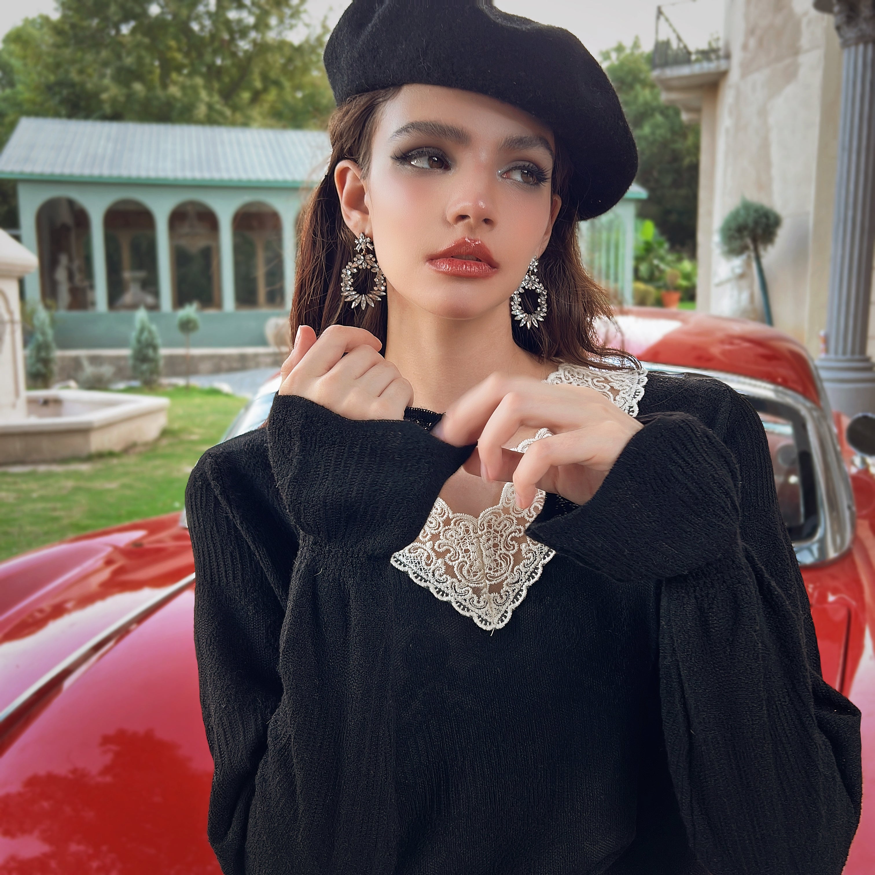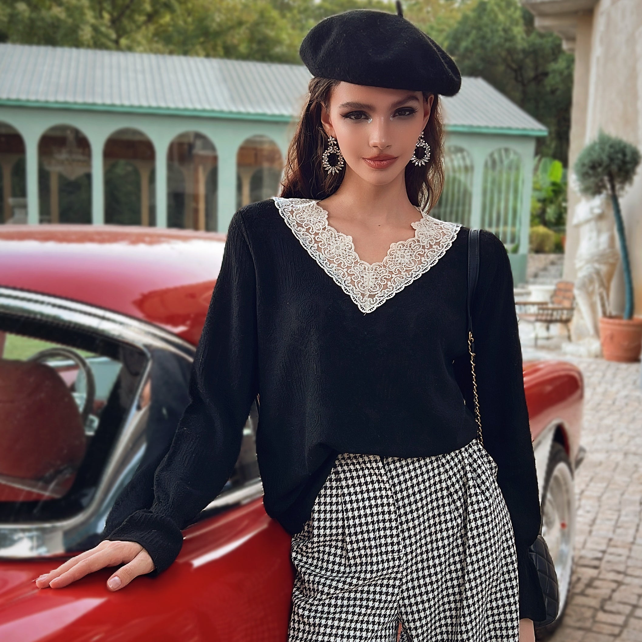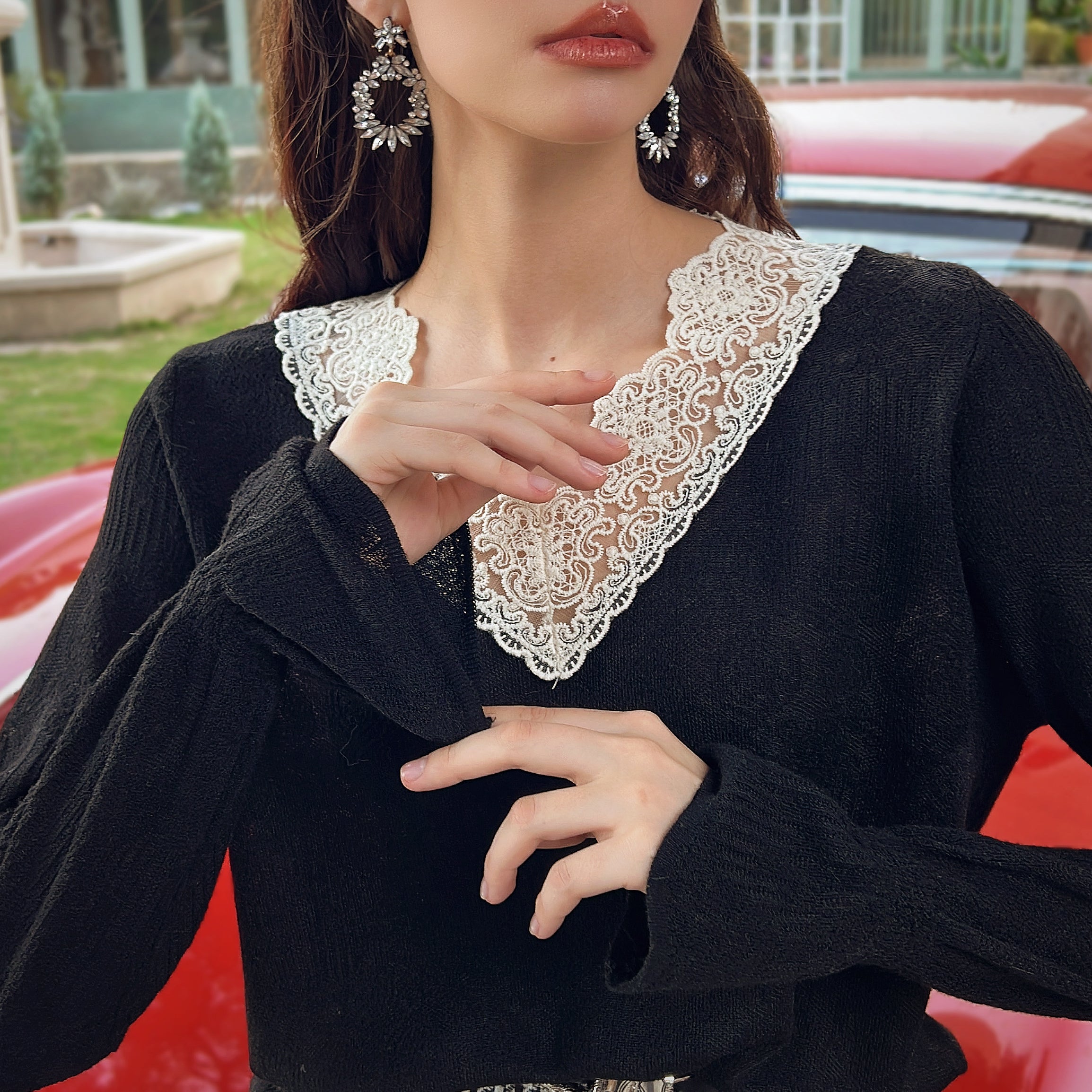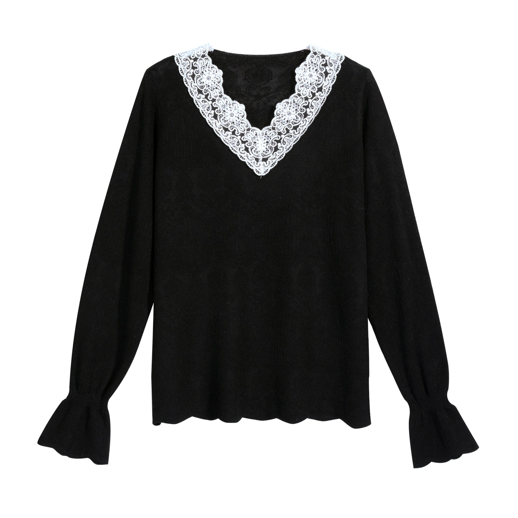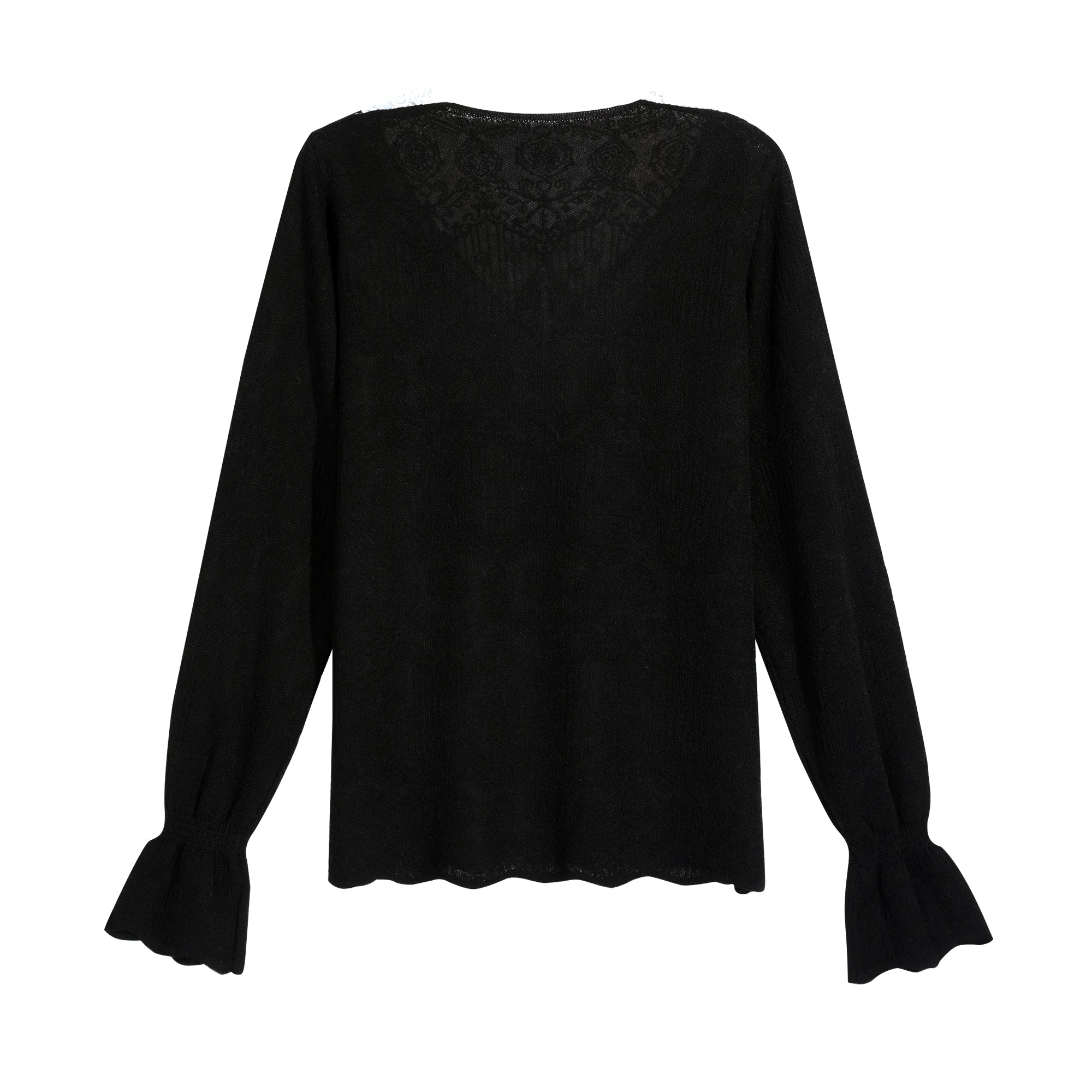 A lightweight black knit with a contrast lace V-neck (front & back) and fluted cuffs. The scalloped hem keeps the finish clean. Easy desk-to-dinner piece that layers under blazers or stands alone with denim and skirts.