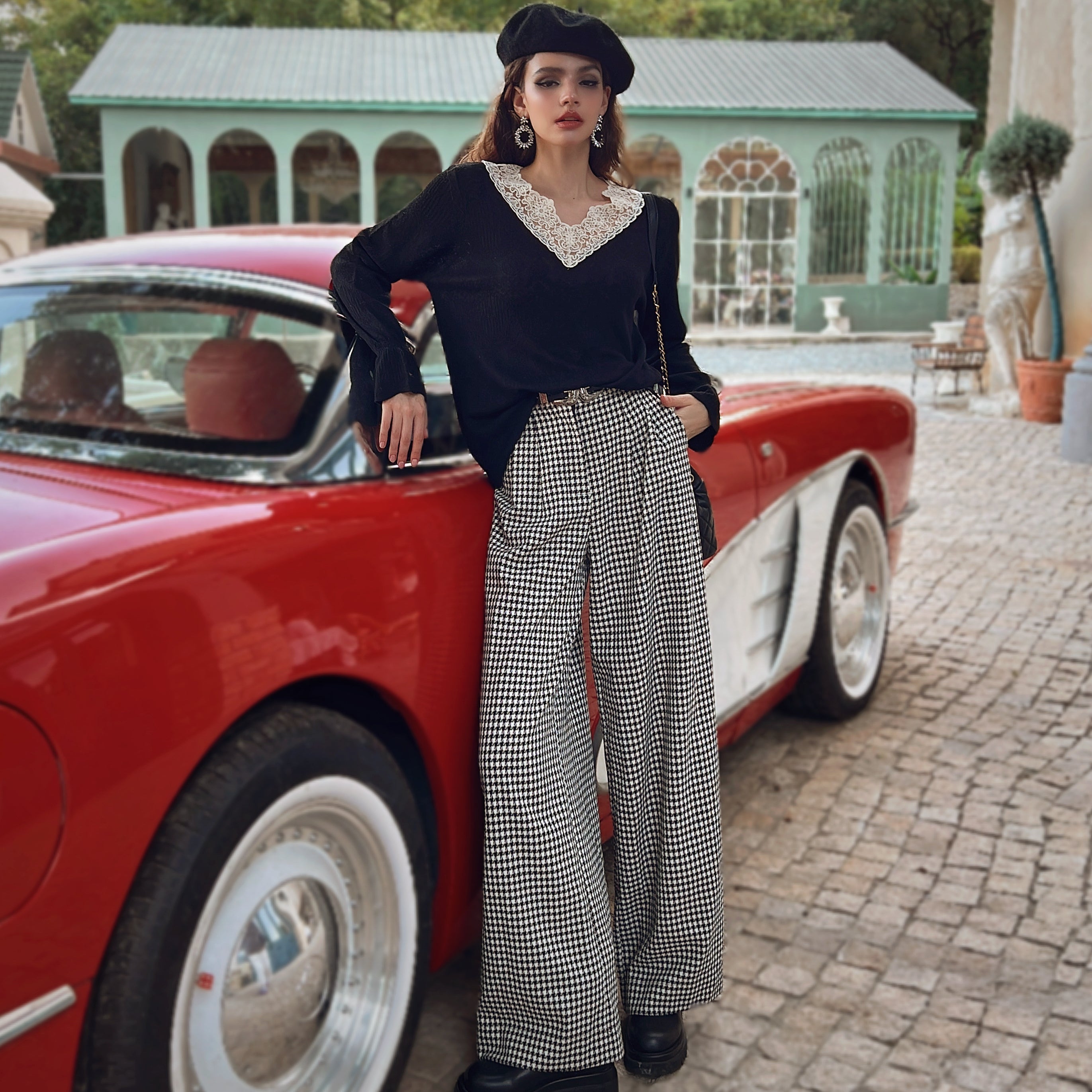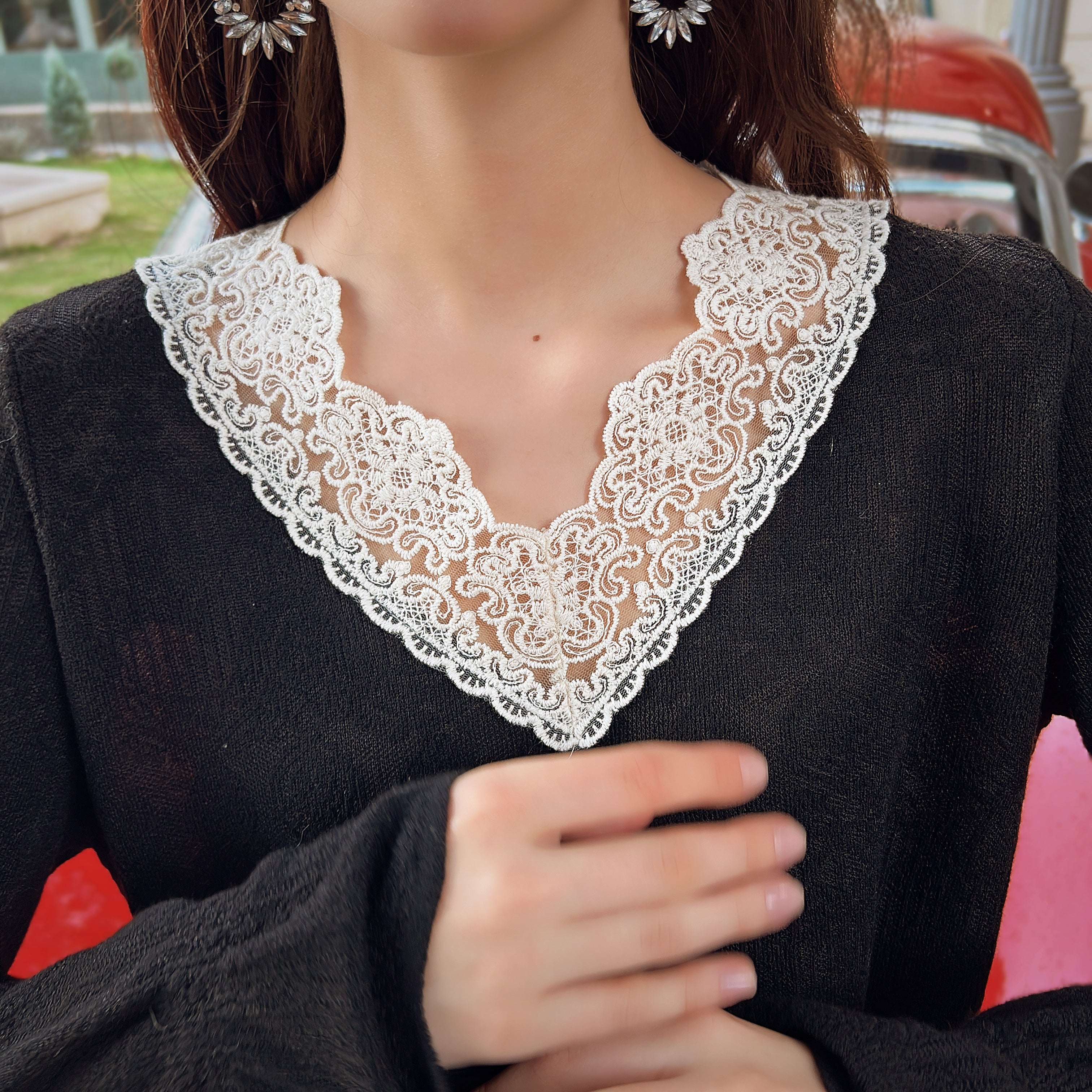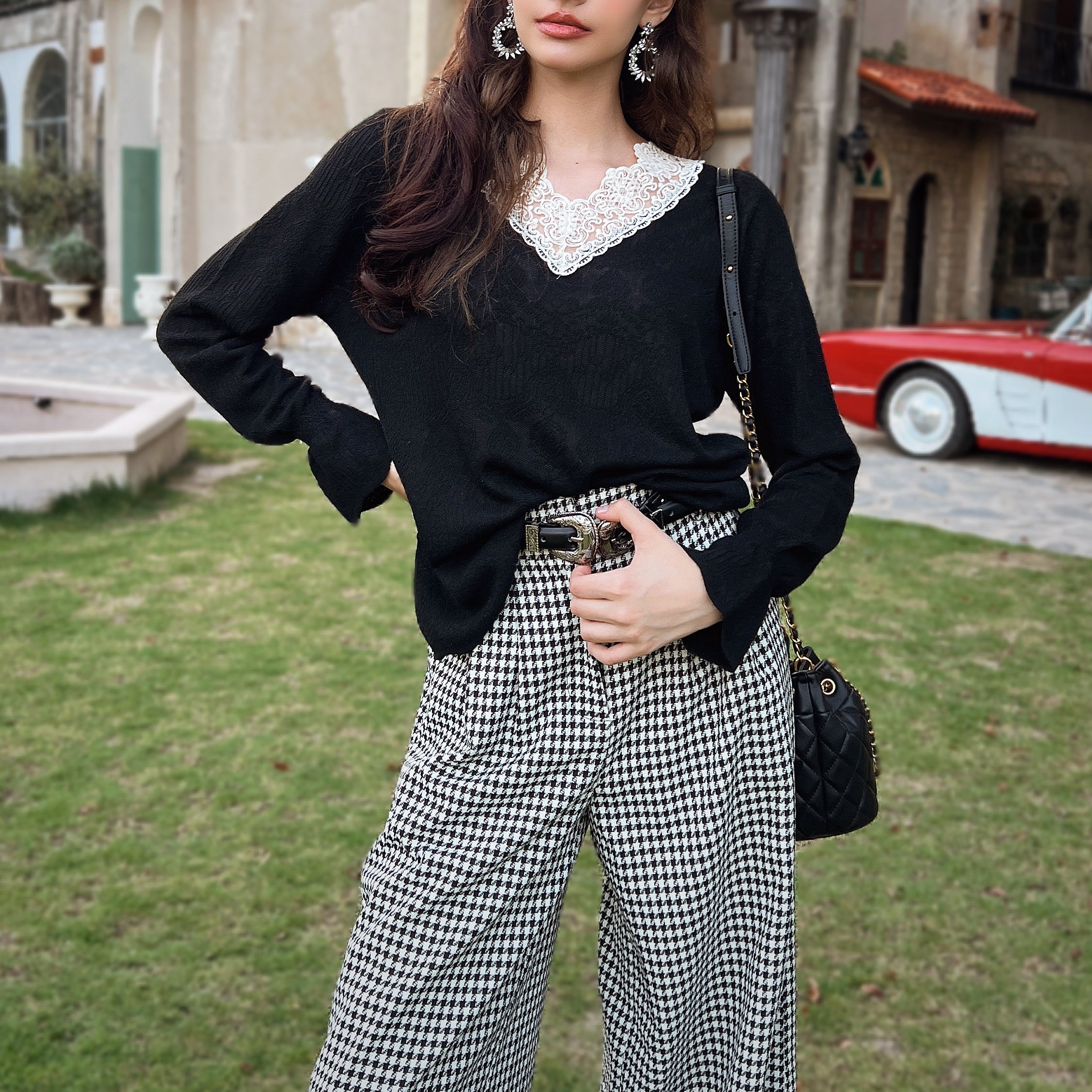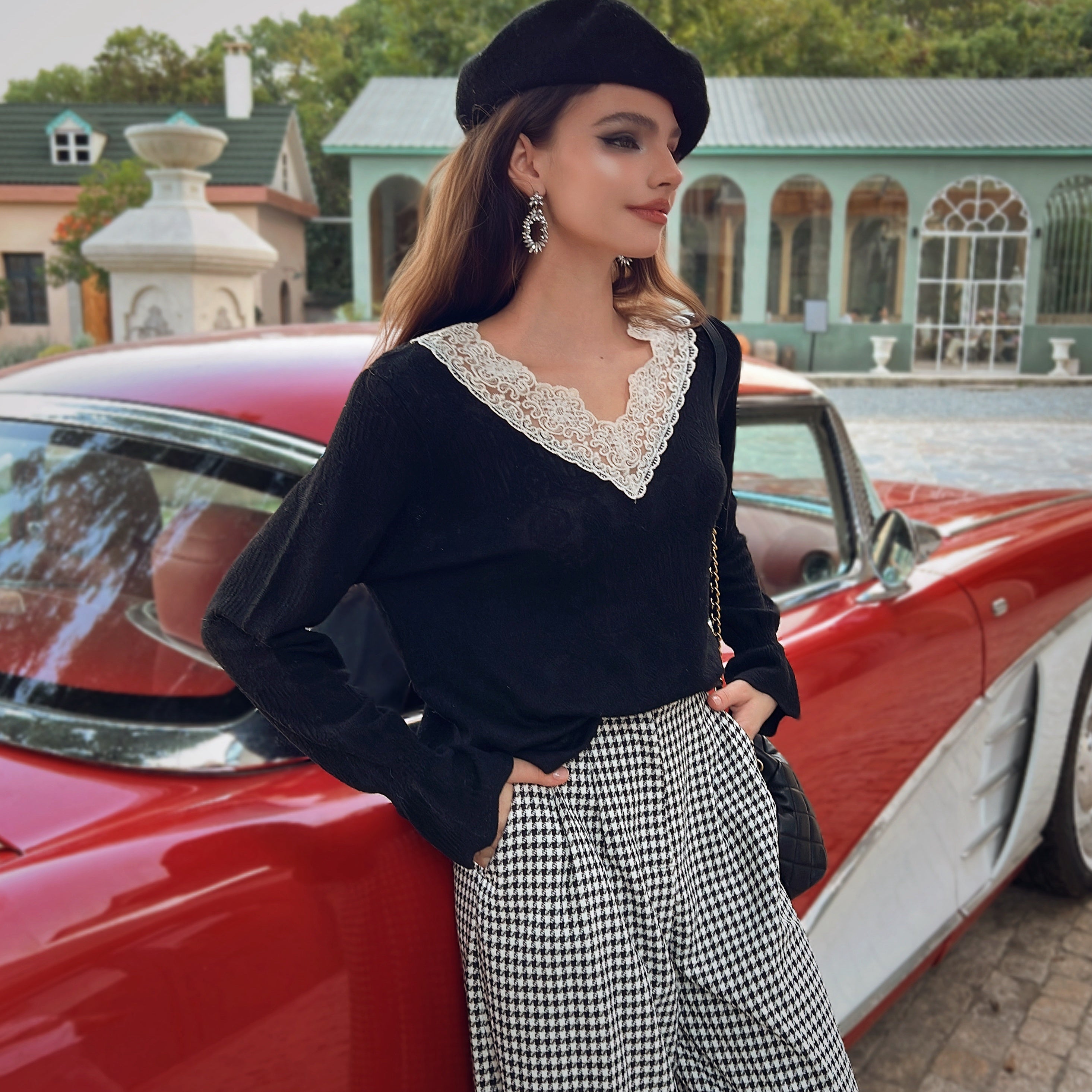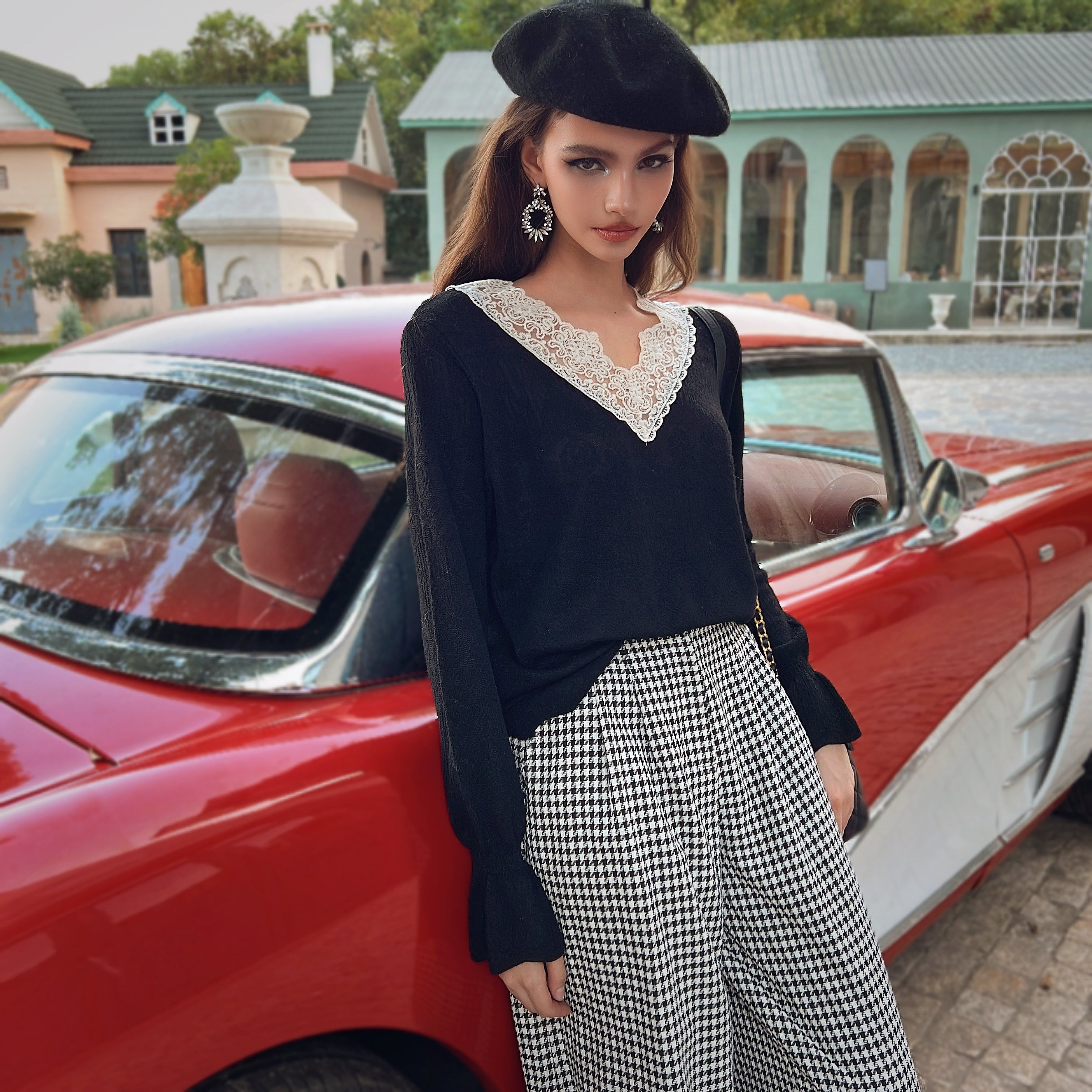 A lightweight black knit with a contrast lace V-neck (front & back) and fluted cuffs. The scalloped hem keeps the finish clean. Easy desk-to-dinner piece that layers under blazers or stands alone with denim and skirts.