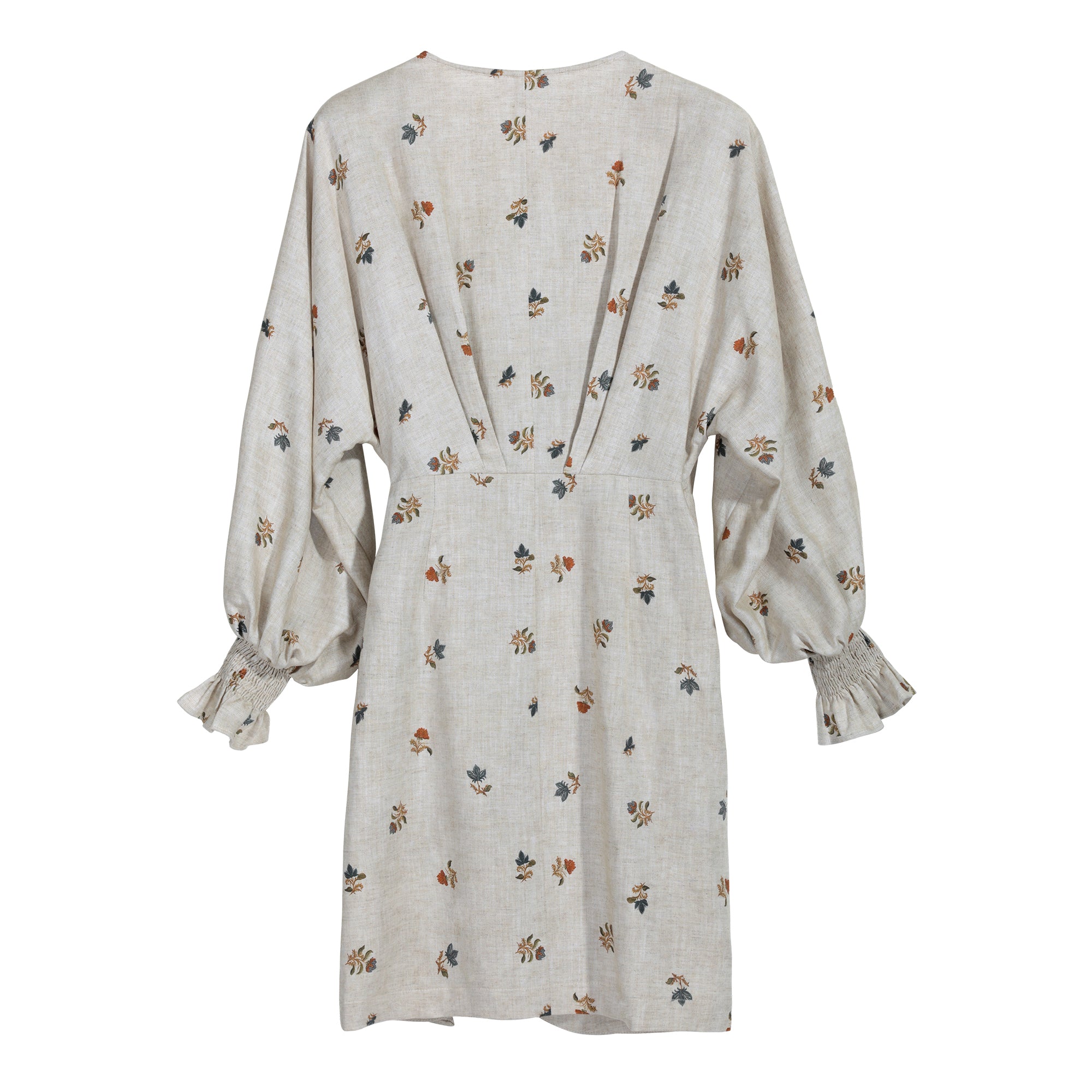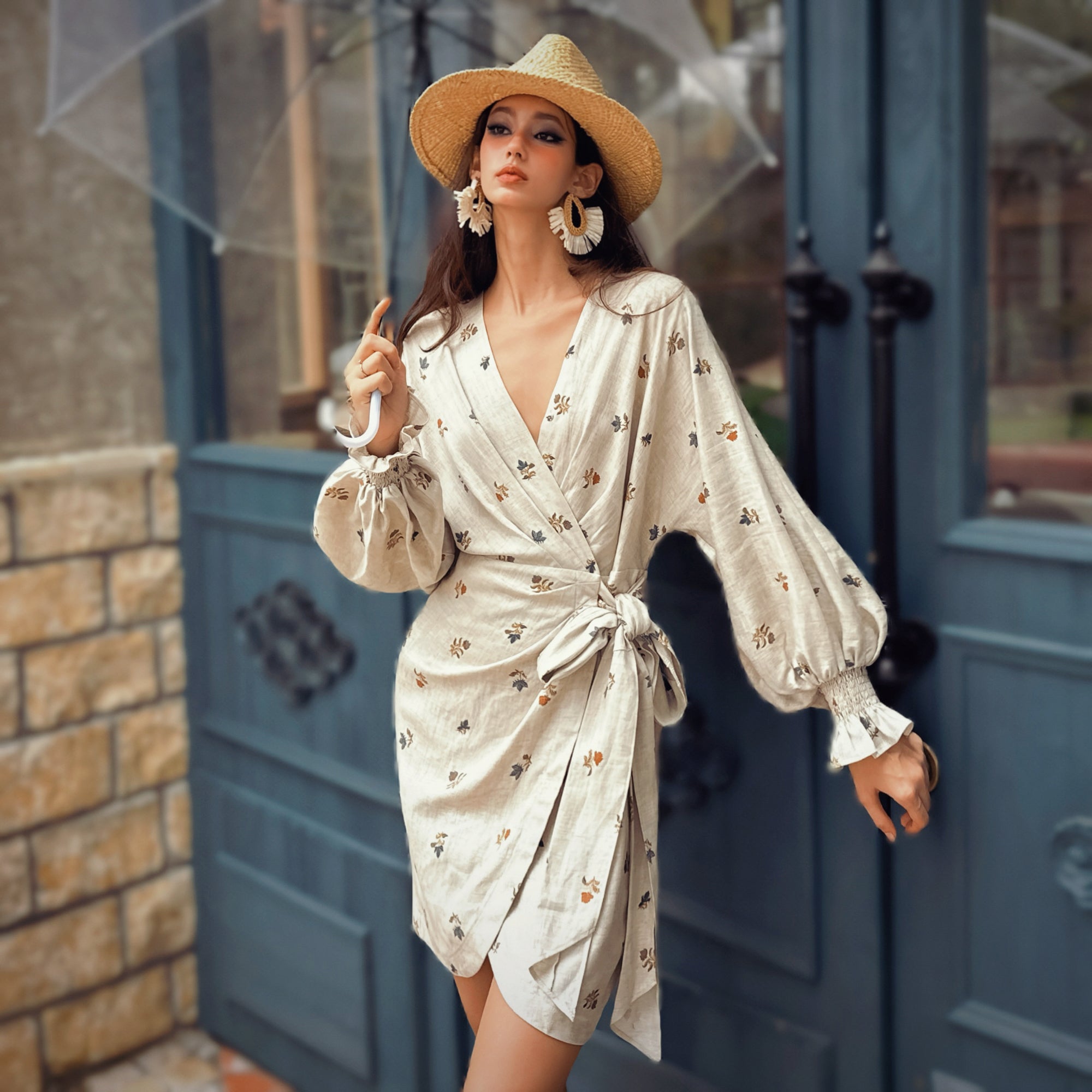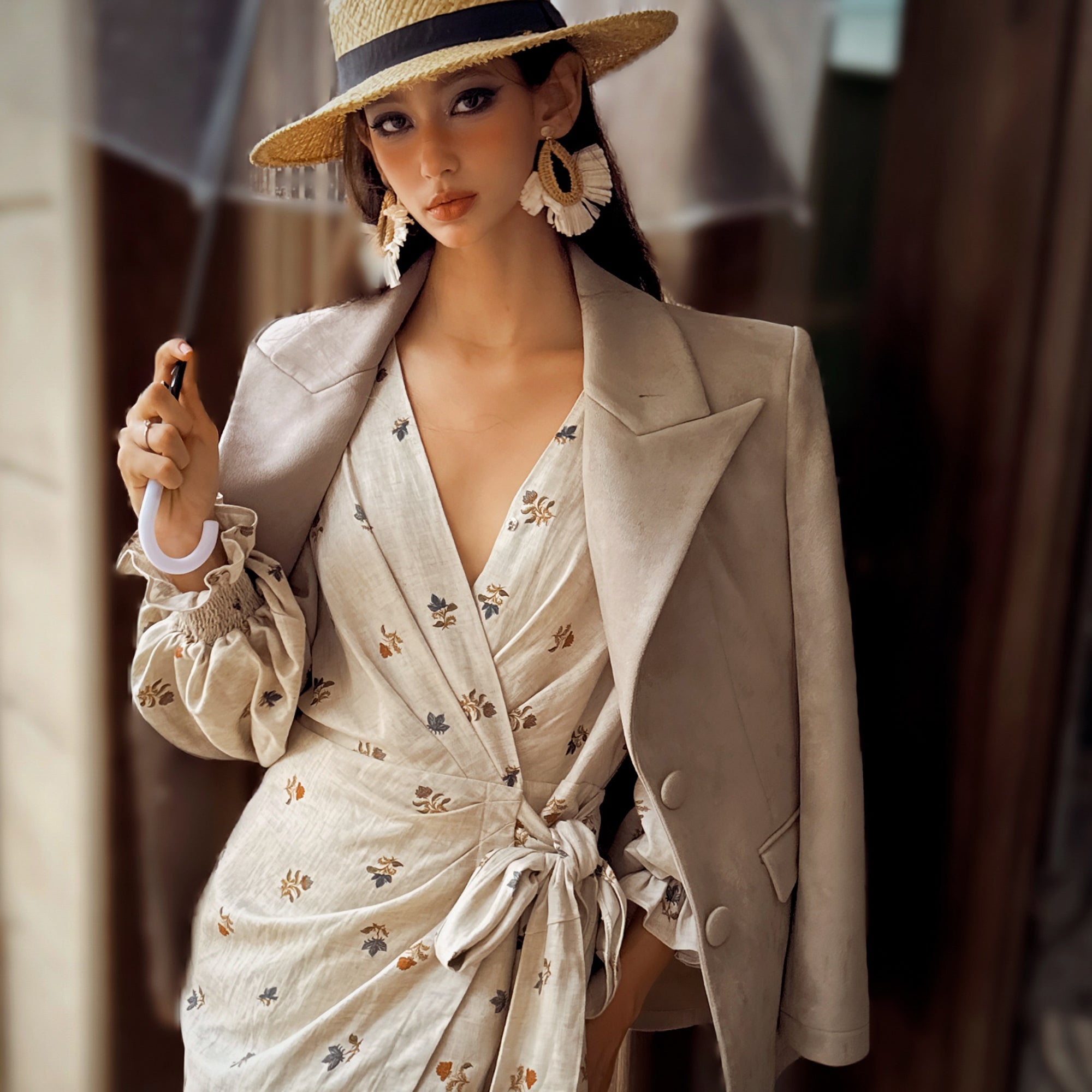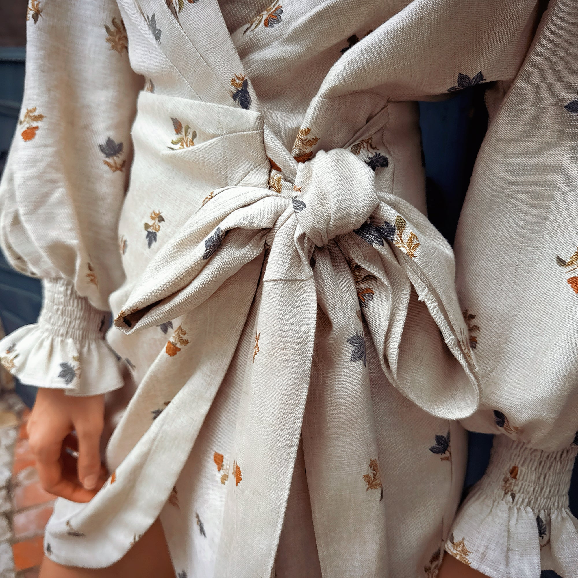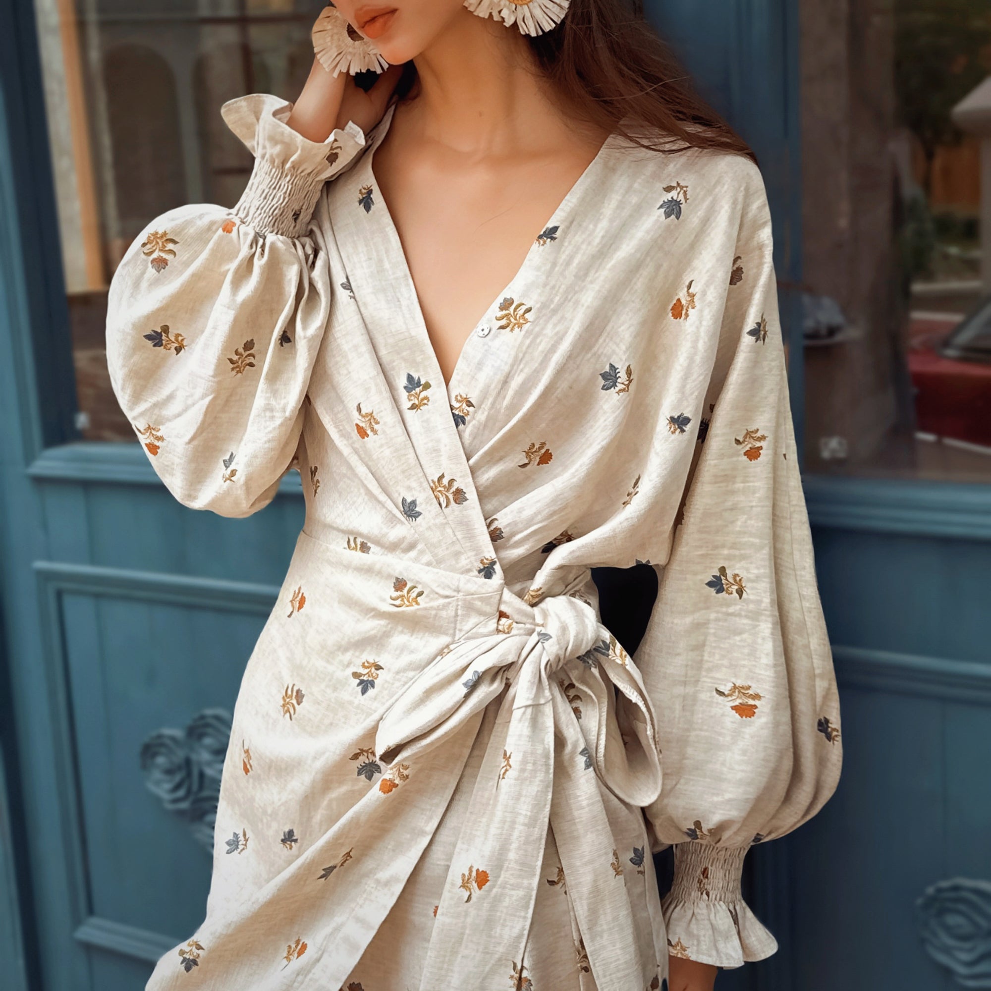 A breezy linen-blend wrap with ditsy florals and that waist-snatching tie. Voluminous sleeves + smocked cuffs bring the drama; the neutral oatmeal base keeps it wearable 24/7. From coffee runs to date night—done.